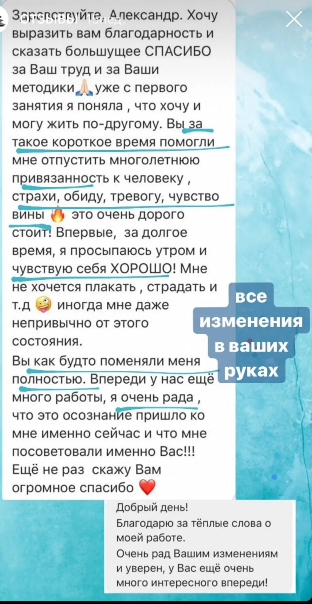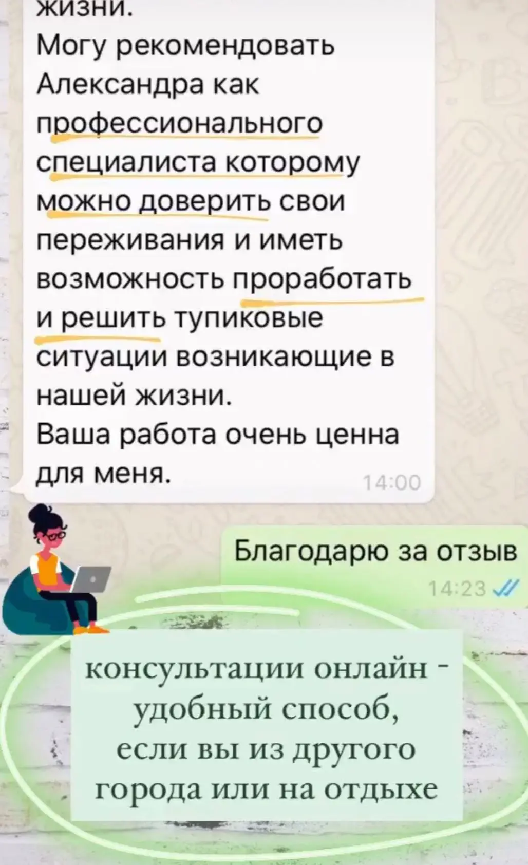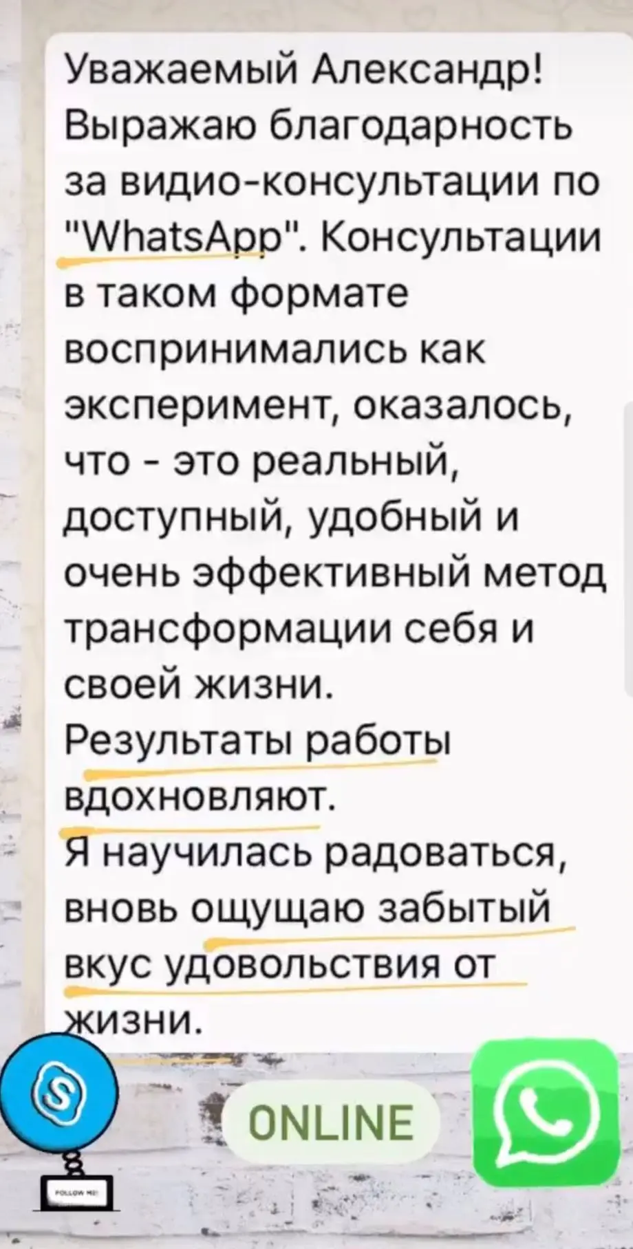 Я провожу онлайн консультации уже более 3-х лет. Благодаря новым технологиям люди из разных городов и даже стран имеют возможность получить помощь у понравившегося им специалиста, единственным условием для консультации - хороший интернет. А также условием является видеосвязь, чтобы я видел изменения, которые происходят с вами.