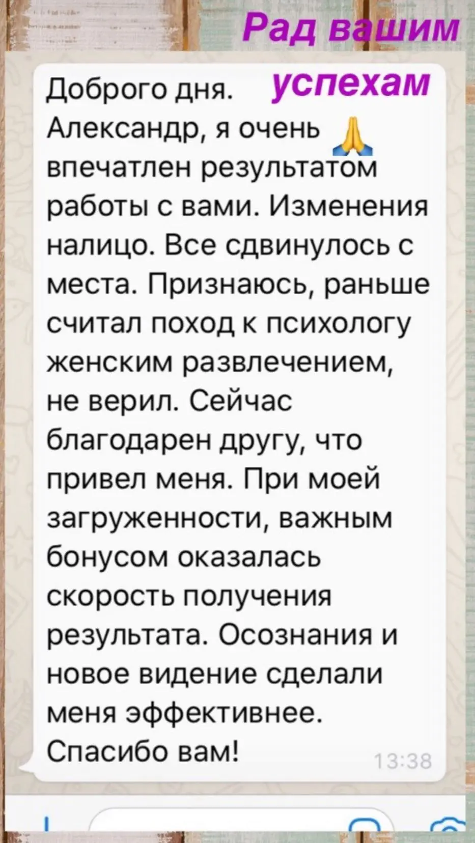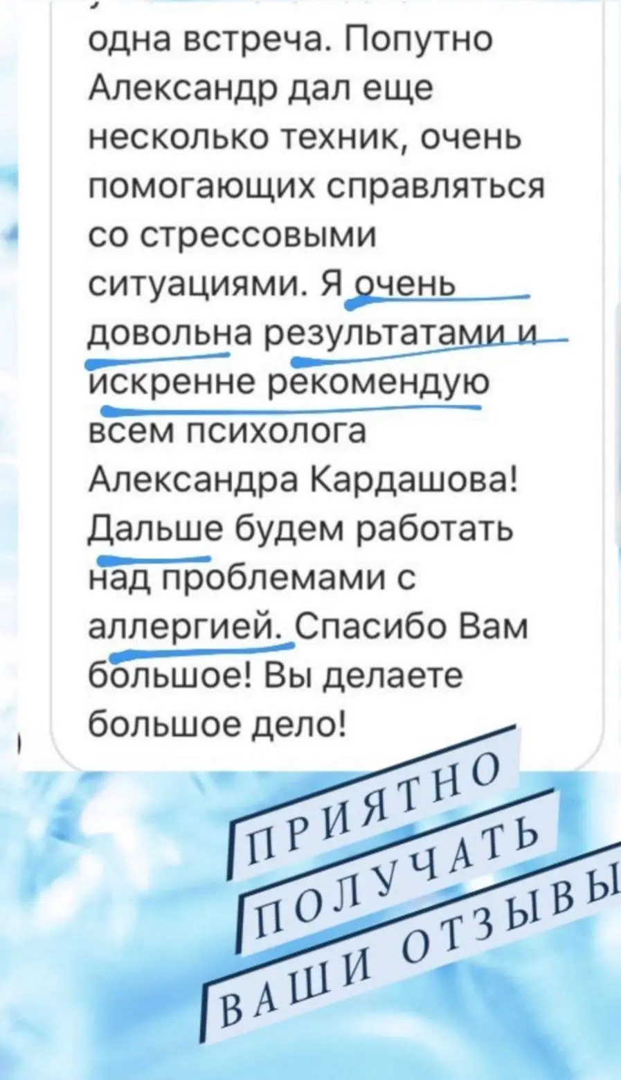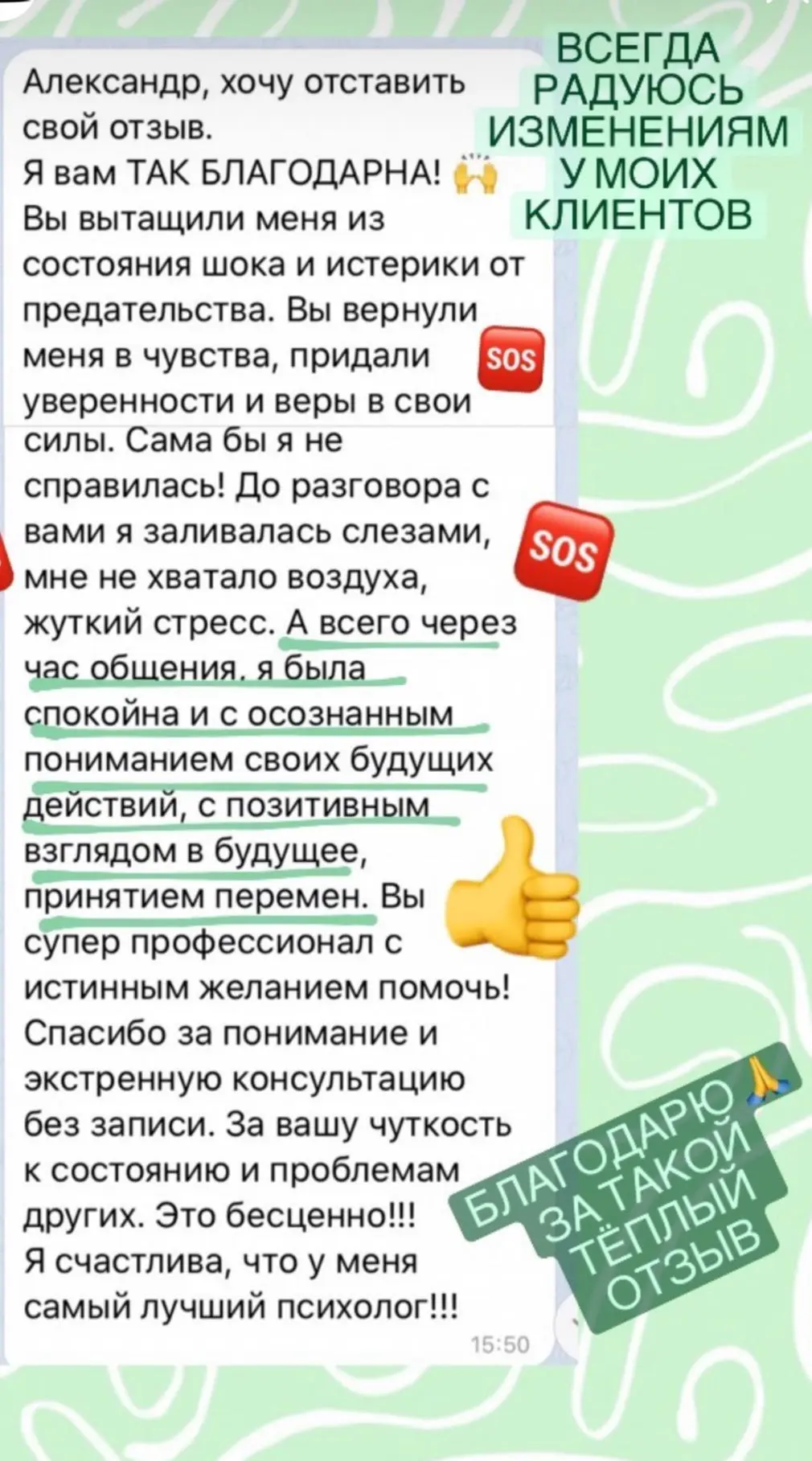 Эффективность онлайн-формата такая же как и при личной встрече, так как я не использую в своей практике телесно-ориентированную терапию.